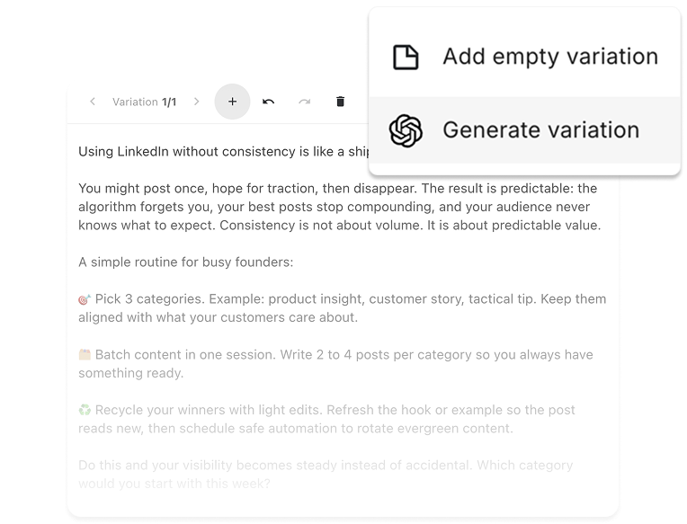 Every post is AI-rewritten before it goes out. Same insight, different angle. Your audience sees a fresh take — not a rerun. You approve everything before it posts.